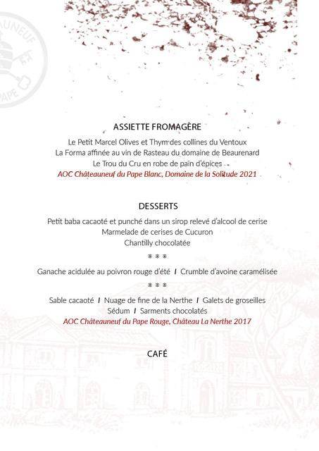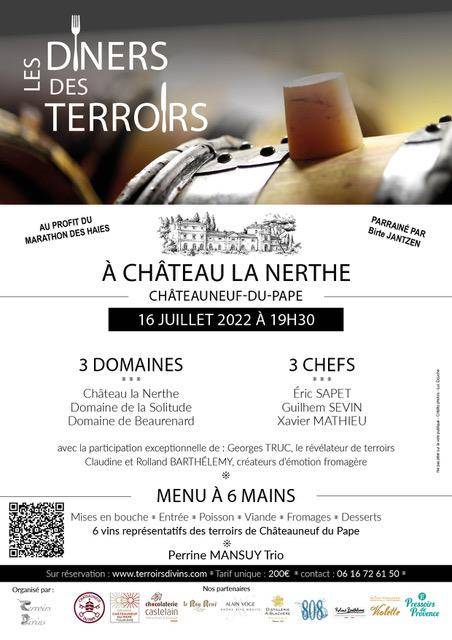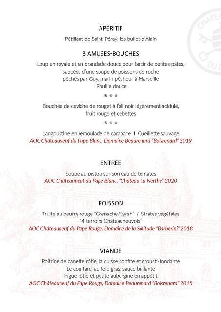 Pour le repas les vins du Château La Nerthe, Domaine de la Solitude, Domaine de Beaurenard seront servis autour des plats des 3 Chefs Eric Sapet, Xavier Mathieu et Guilhem SEVIN.